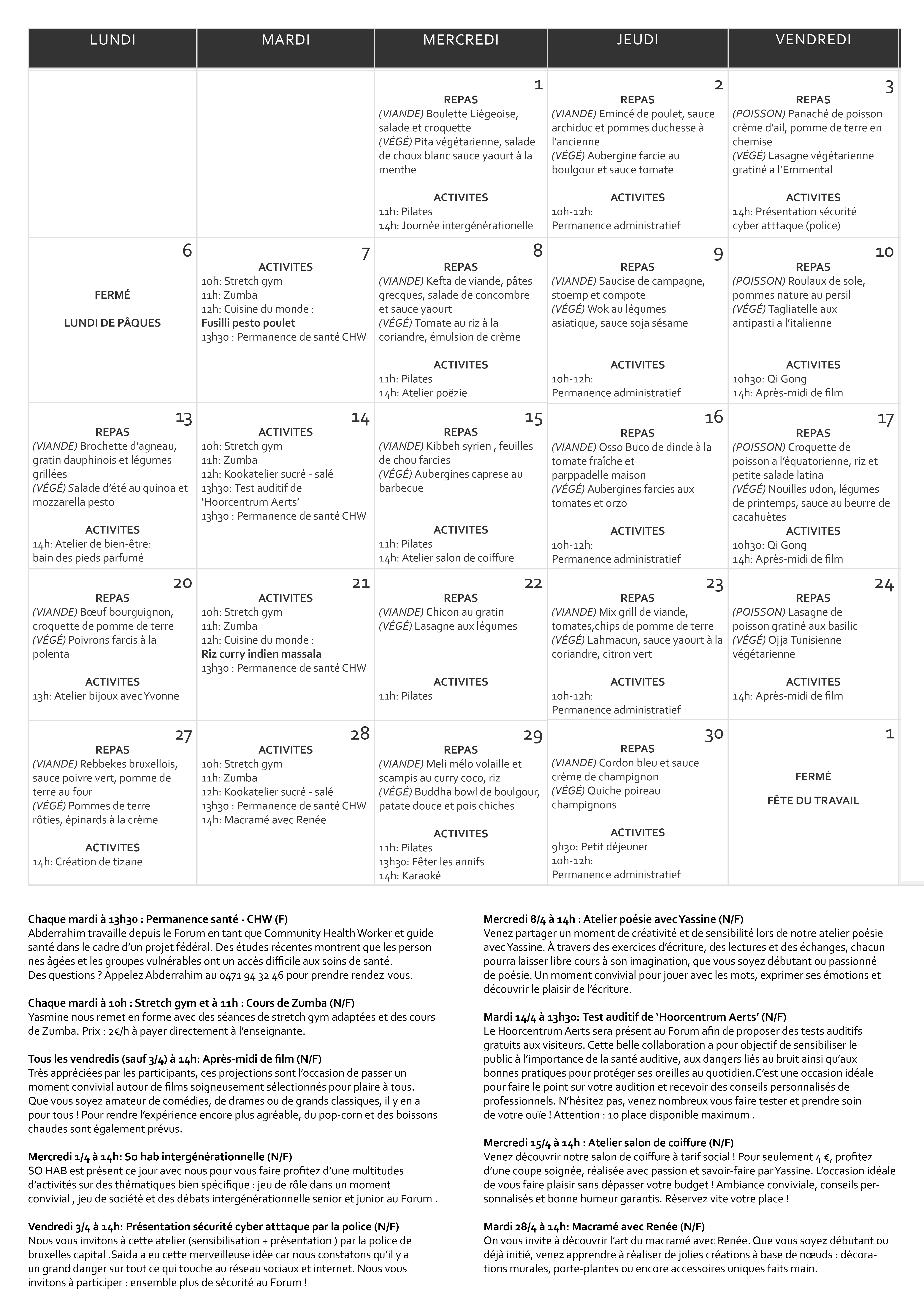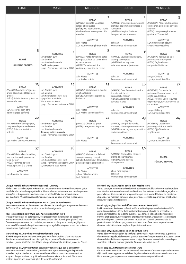 Forum organiseert ook socio-culturele activiteiten van allerlei aard voor de oudere buurtbewoners. Het dienstencentrum geeft ook plaats aan de artistieke talenten van de Brusselse ouderen, door in ‘de vitrine’ tijdelijke expo’s te organiseren.