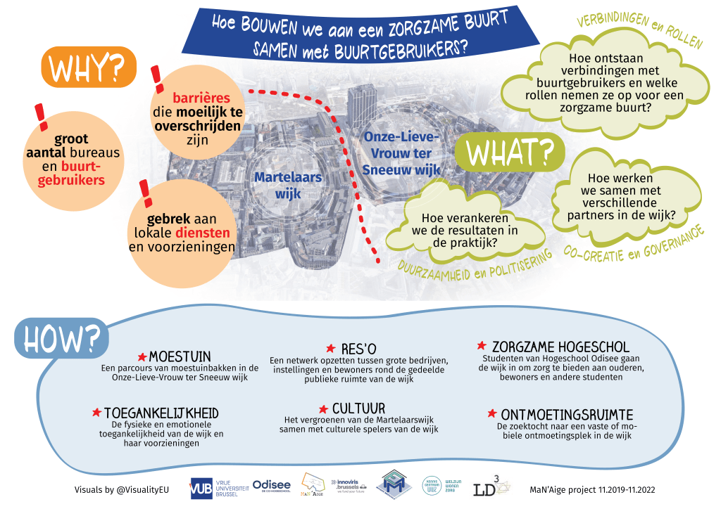 LD³ Het Anker ligt aan de basis van het MaN’Aige project. Het project verkent hoe we aan een zorgzame buurt kunnen bouwen in twee wijken van 1000 Brussel: